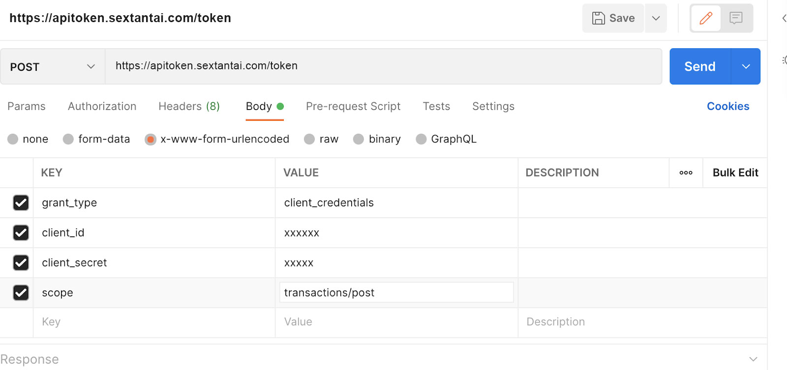 - Key: client_secret | Value: the secret copied from the Sextant AI credentials under API access with the copy button