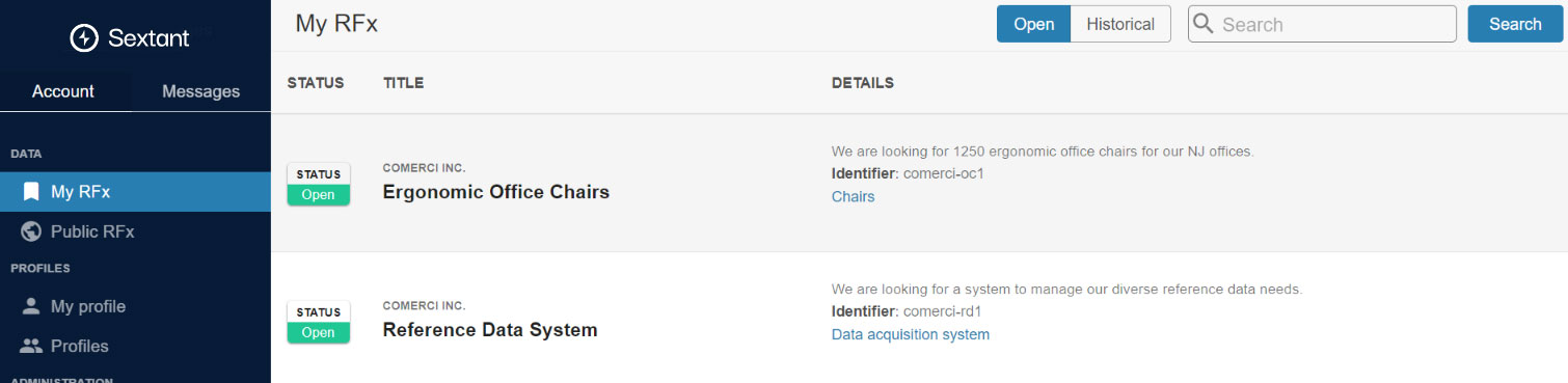 1. Select “My RFx” in the left hand menu and make sure “Open” is toggled at the top of the screen. You will see a list of RFx to which you have been invited in the main window.