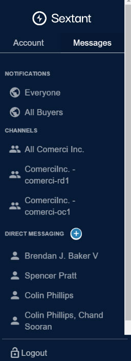 There are several existing group messages, or communication “channels”, already. One is for internal use at this supplier’s company. The other two are connected to specific RFQs. We know this because the project identifier is in the name of the channel, e.g. “ComerciInc. – comerci-rd1”.