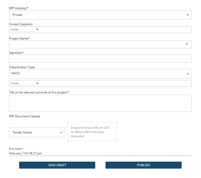 2. Select either “Private” or “Public” from the first dropdown menu. In a private RFP, the buyer selects the recipients, say from vendors they have vetted previously. In a public RFP, everyone on Sextant AI can see the bid solicitation. The default selection is “Private”.