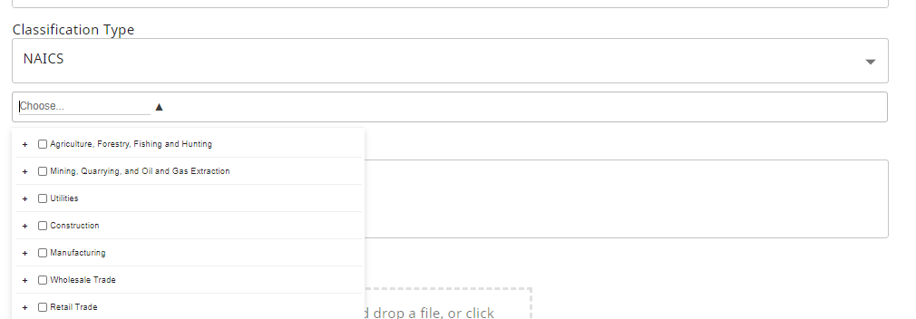 6. Choose either an NAICS or a UNSPSC industrial code, using the drop down menu